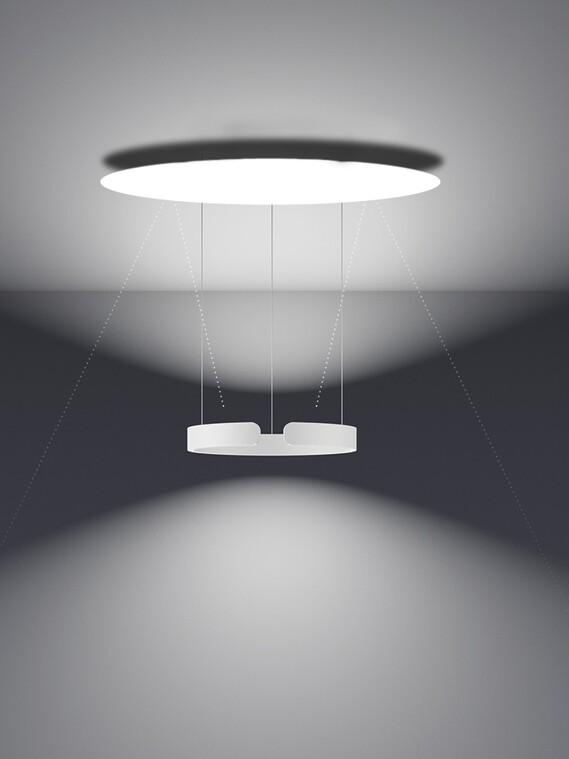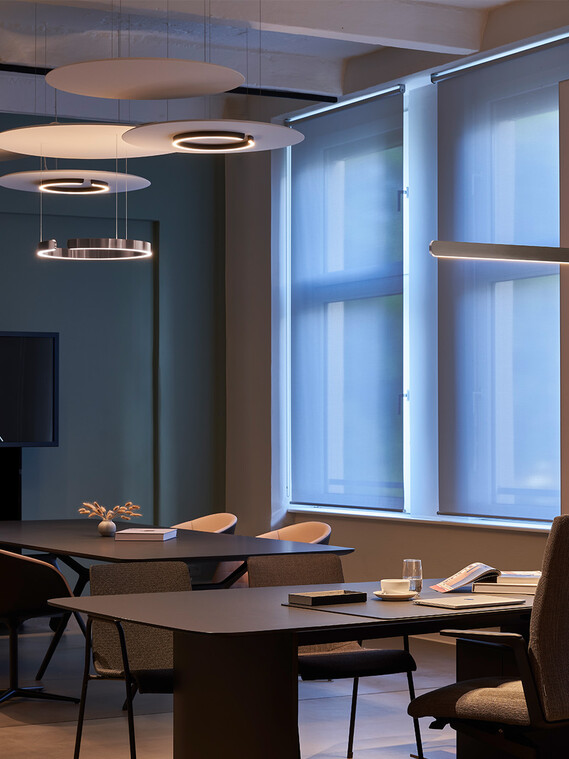 Occhio acoustic luminaires provide additional sound absorption, which significantly reduces the reverberation time in the room – and improves the room acoustics remarkably. They are available with and without any luminaire.
