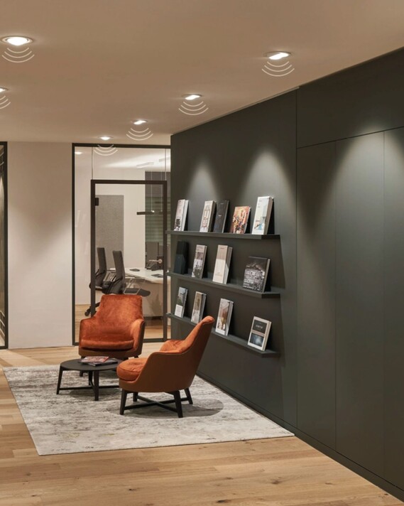 Basta un semplice movimento per accendere o spegnere la luce, mentre il momento della giornata ne determina il colore e l’intensità. I rilevatori di movimento con sensori di presenza e luminosità offrono un controllo automatizzato dei corpi illuminanti. In base al momento della giornata e alla luminosità dell’ambiente, i colori e l’intensità della luce vengono regolati automaticamente. Attraverso la funzione di riconoscimento dei movimenti, i sensori accendono o spengono i corpi illuminanti. L'attenzione rivolta nei confronti del bioritmo naturale, è motivata dall'intento di migliorare il benessere e le capacità di concentrazione.
